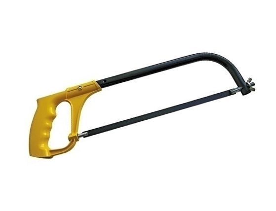 - Ножовка по металлу классической формы со стальной рамой и алюминиевой окрашенной ручкой.