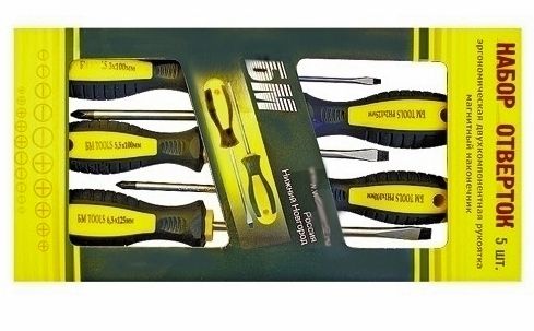 Состоит из 5 отверток в картонном футляре с окном.